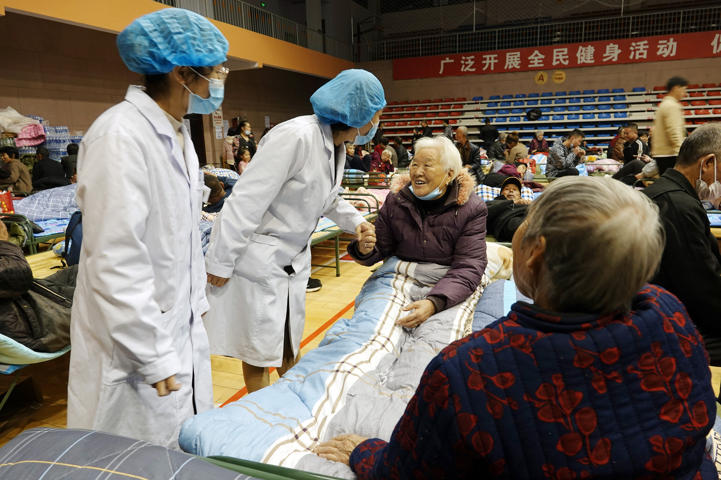 10月8日,在運城市新絳縣體育館安置點,兩名值守醫(yī)護人員(左)了解洪峰受災(zāi)群眾身體健康情況。高新生攝