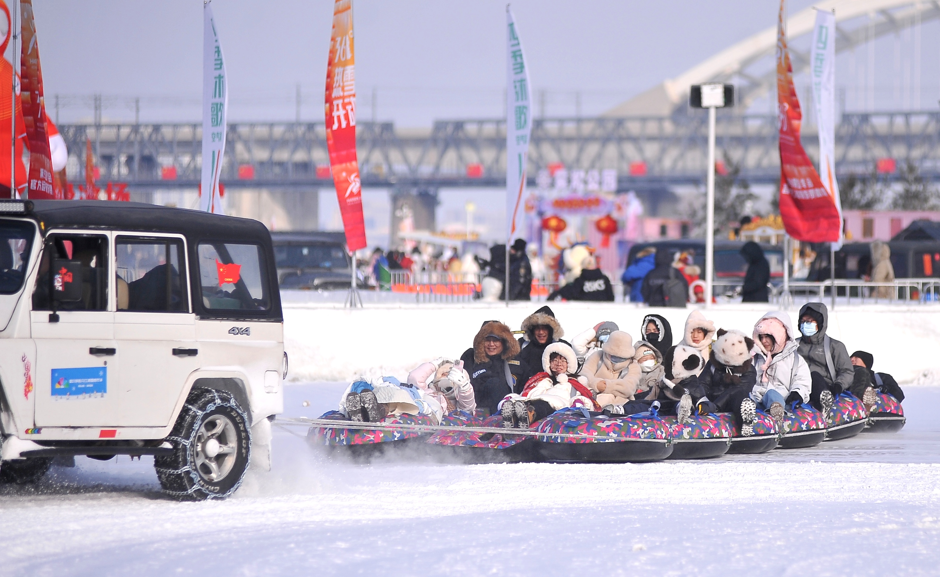 28日,除夕。哈爾濱市松花江冰雪嘉年華園區(qū)內(nèi),許多南方游客在玩冰樂雪。