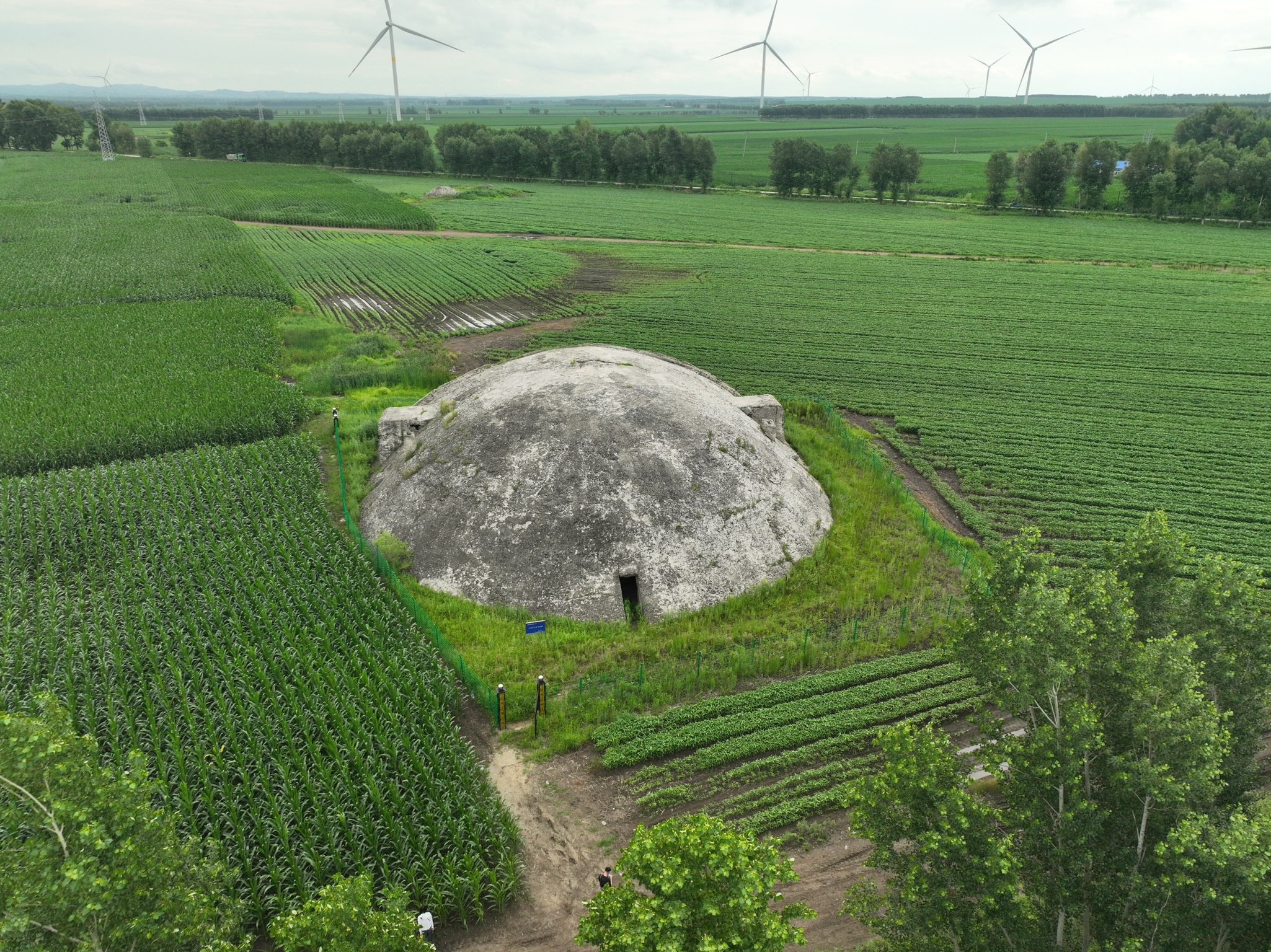 向土龍山鎮(zhèn)東行約1.5公里,一座形似巨大頭盔的混凝土建筑突兀地蟄伏于曠野——這便是“土龍東門(mén)外飛機(jī)堡”遺址。它是當(dāng)年日本為侵略擴(kuò)張所建龐大機(jī)場(chǎng)網(wǎng)絡(luò)中僅存完整的飛機(jī)庫(kù),直徑逾10米,墻體厚達(dá)60厘米,冷硬地矗立了八十余載。