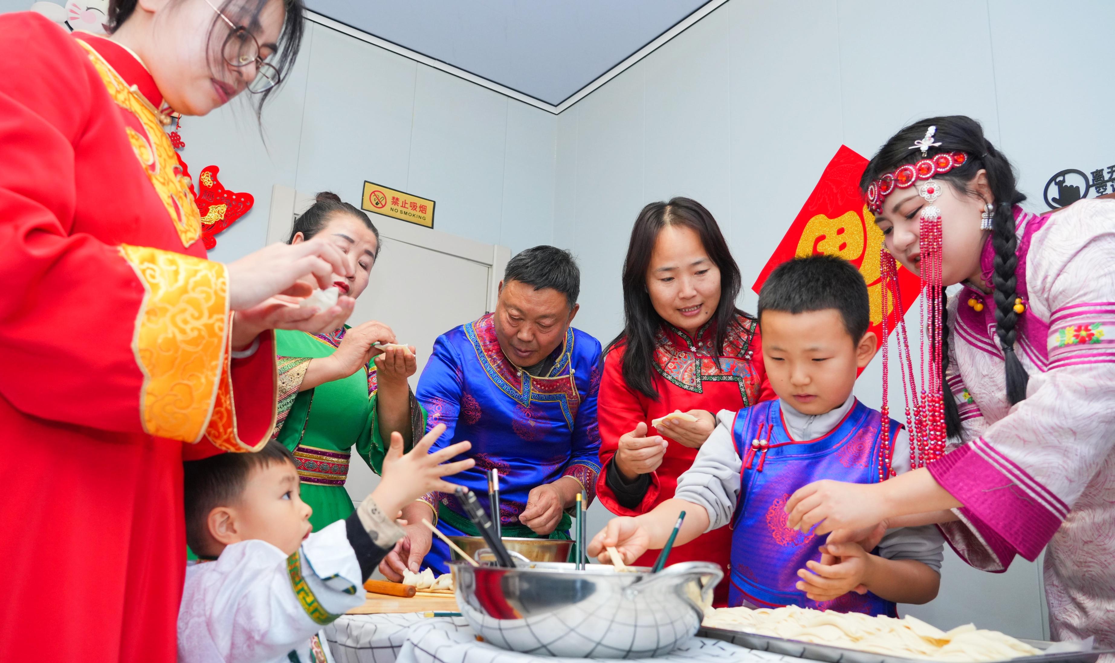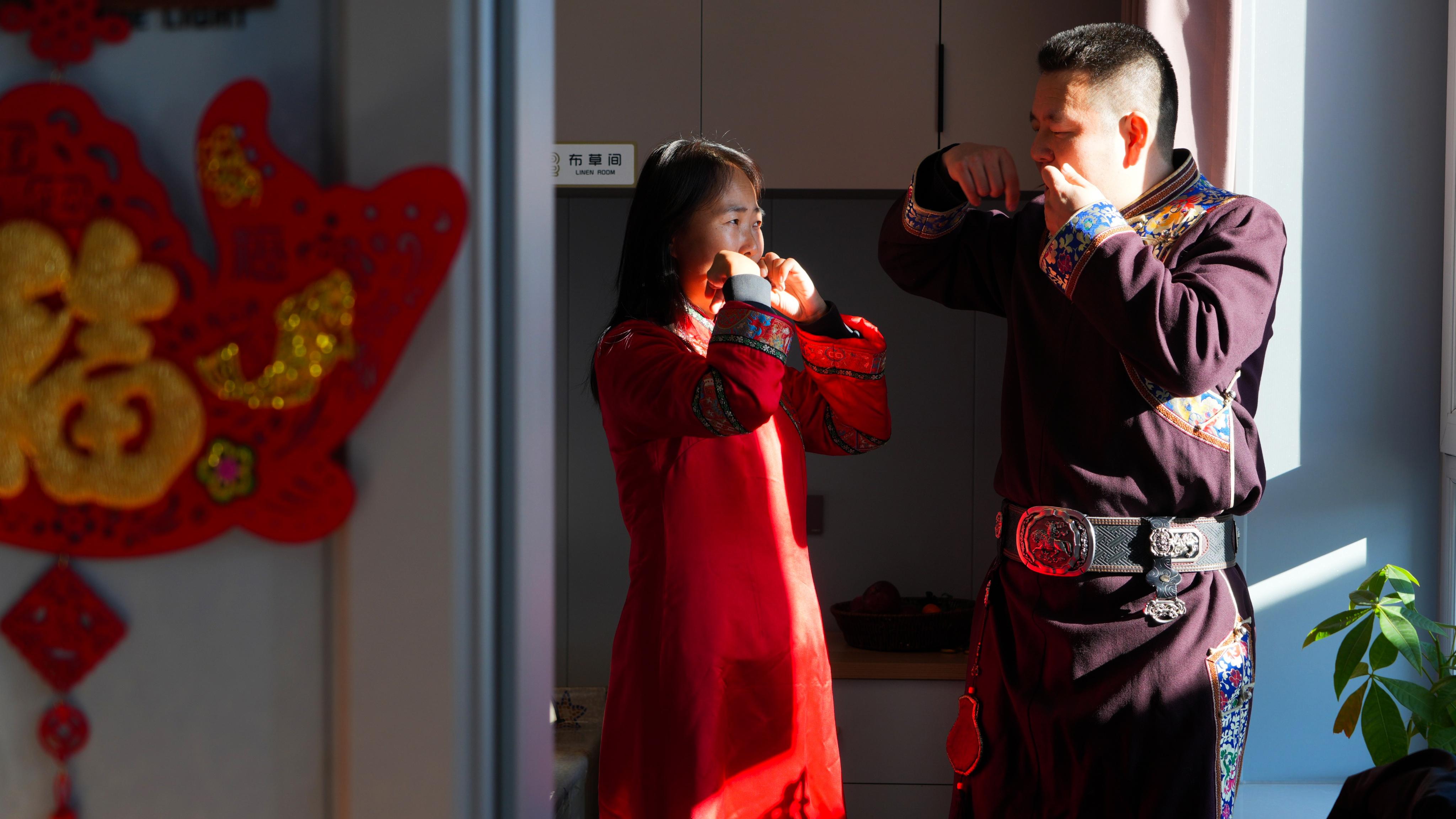 “達(dá)斡爾族小年的規(guī)矩是得貼福字、包餃子,這樣福氣才能留得?。 惫乱贿呎泻羿従訋兔Σ贾梅块g,一邊笑著說,“今年我愛人在外地,小年回不來,多虧了這些好鄰居,雖然人不齊,但‘年味’一點(diǎn)不能少?!?/p>